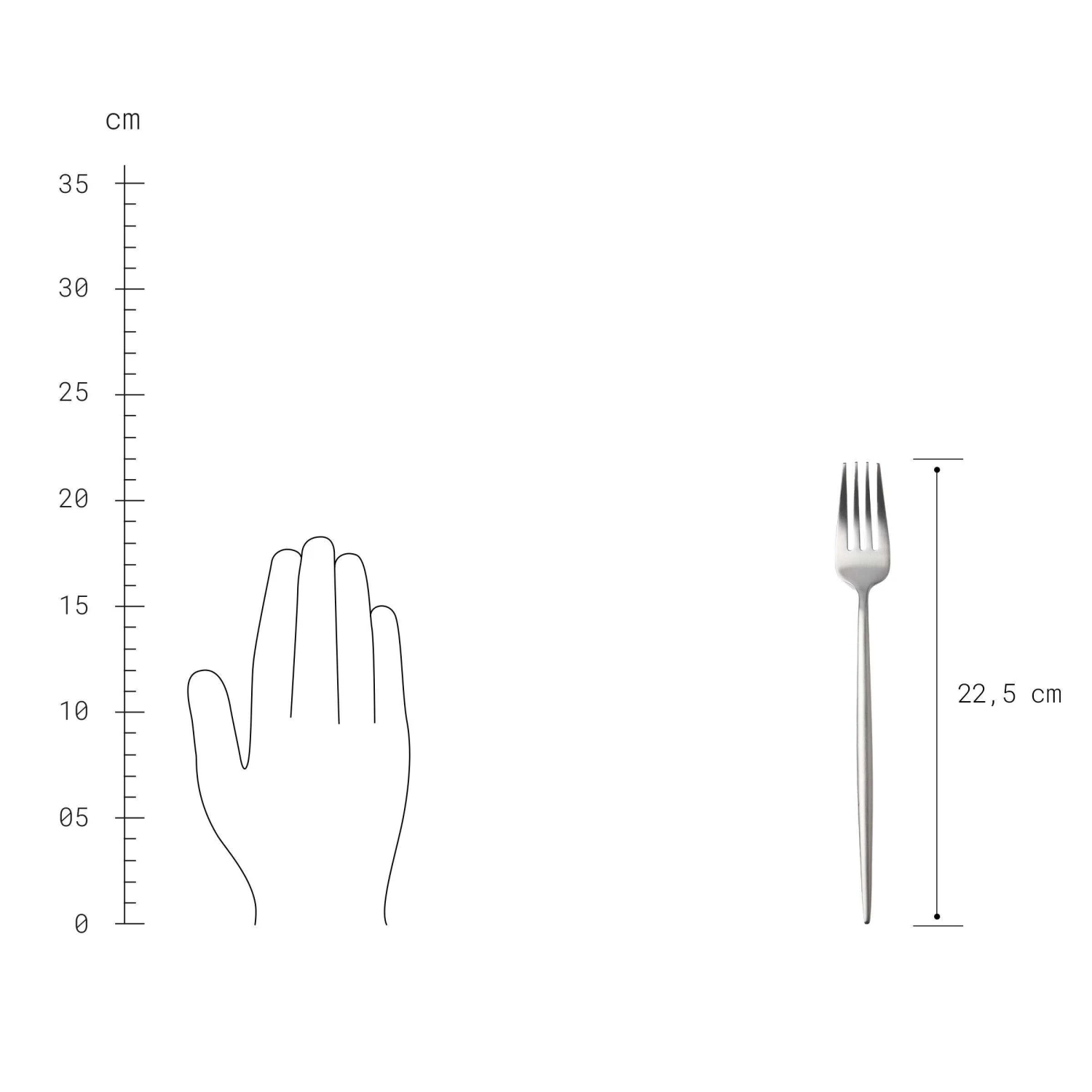 Messer: Länge 22 cm, Gabel: Länge 22,5 cm, Löffel: Länge 21,5 cm, Teelöffel: Länge 13 cm